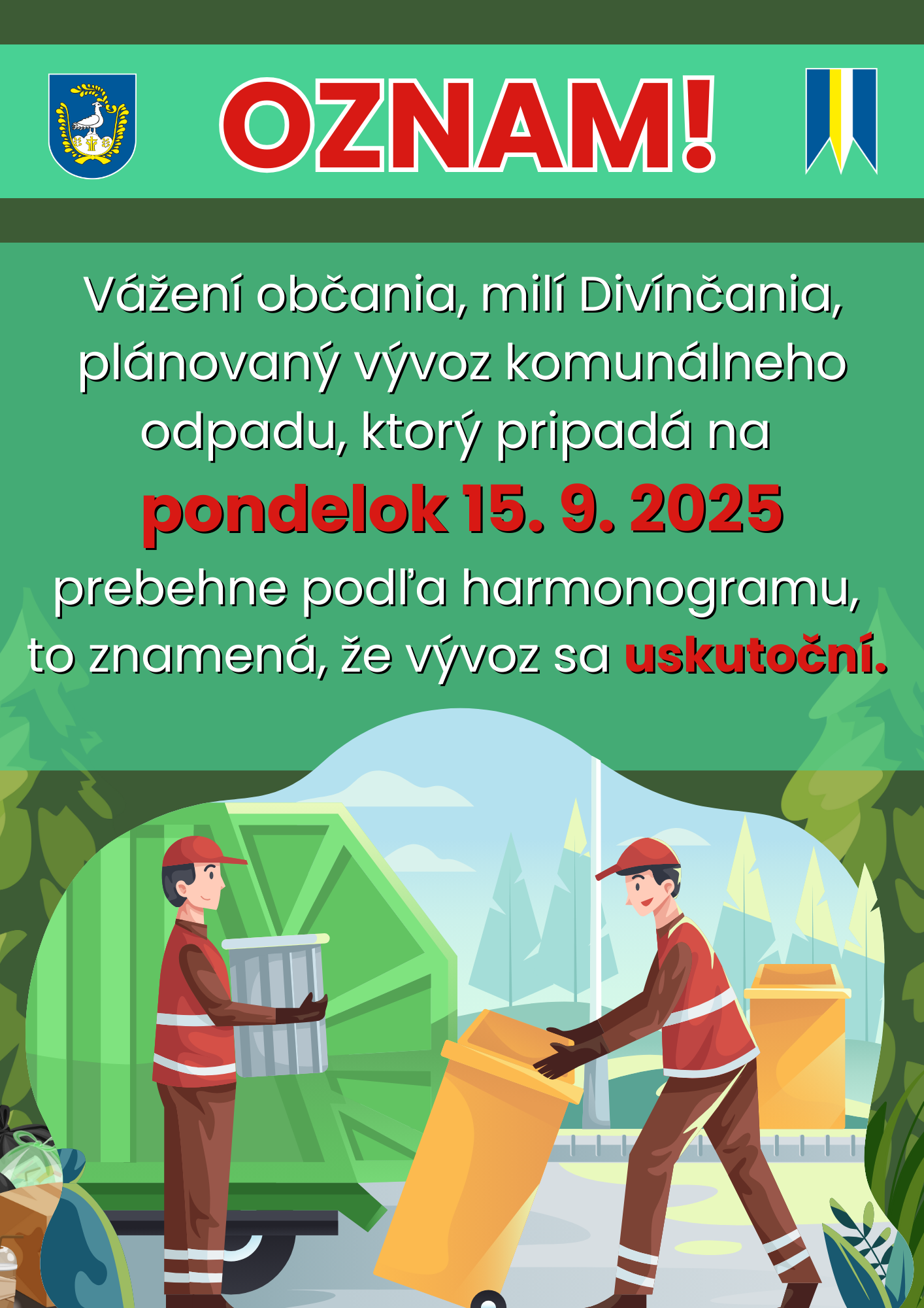 plánovaný vývoz komunálneho odpadu, ktorý pripadá na pondelok 15. 9. 2025 prebehne podľa harmonogramu, to znamená, že vývoz sa uskutoční.