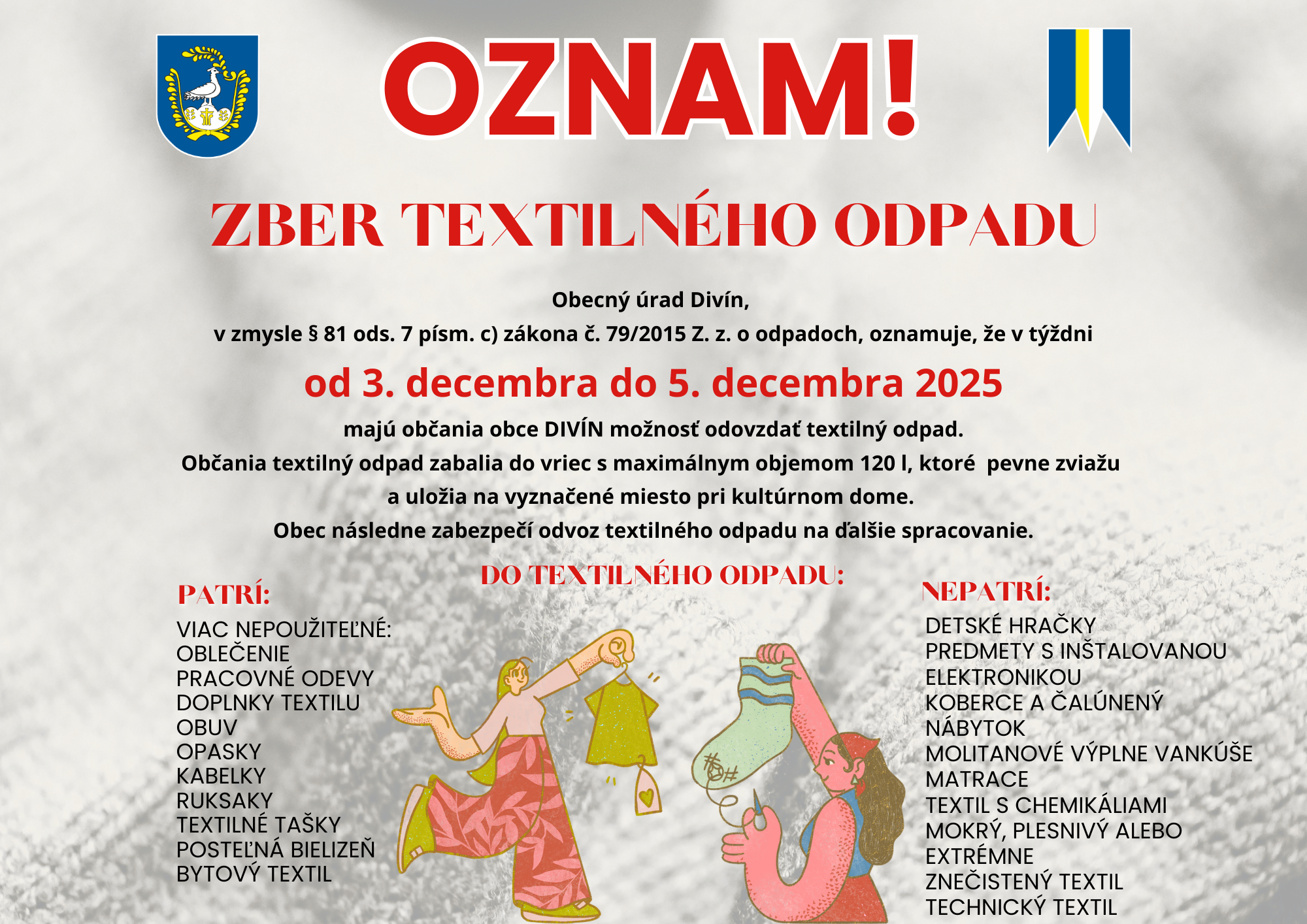 Obecný úrad Divín, v zmysle § 81 ods. 7 písm. c) zákona č. 79/2015 Z. z. o odpadoch, oznamuje, že v týždni od 3. decembra do 5. decembra 2025 majú občania obce DIVÍN možnosť odovzdať textilný odpad.