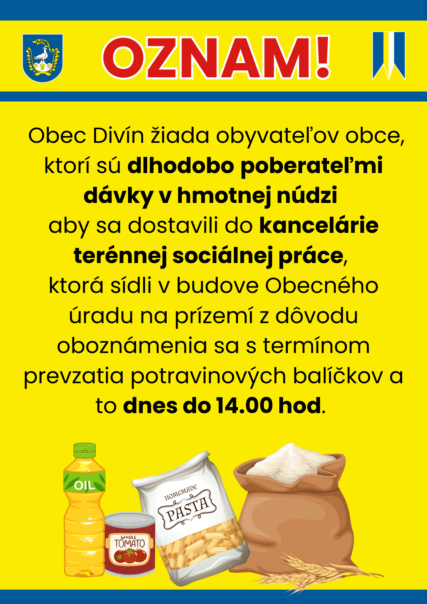 Obec Divín žiada obyvateľov obce, ktorí sú DLHODOBO poberateľmi dávky v hmotnej núdzi aby sa dostavili do kancelárie terénnej sociálnej práce, ktorá sídli v budove Obecného úradu na prízemí z dôvodu oboznámenia sa s termínom prevzatia potravinových balíčkov a to dnes do 14.00 hod.